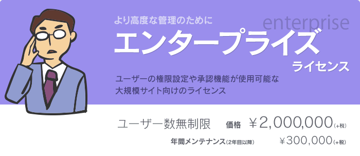 エンタープライズライセンスは、スタンダードライセンスの基本機能に加えて、承認機能や細かなユーザー権限の管理を必要とするようなサイトの場合におすすめします。