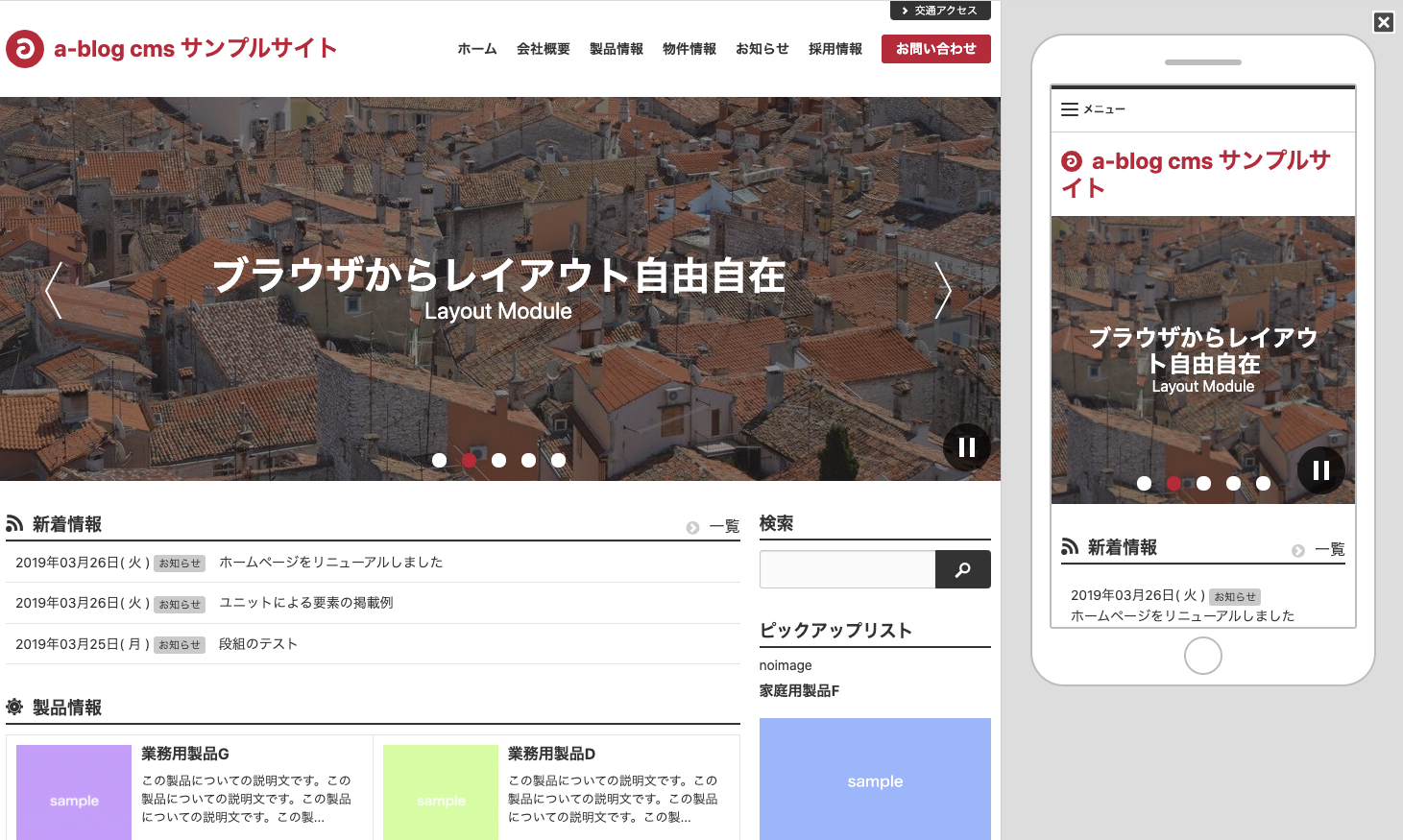 この機能は、a-blog cms に同梱されているテーマ「Site」で利用できます。Siteでの利用を元に説明を進めますが、独自に作成したテーマをご利用の場合には別途テンプレートファイルに変更が必要です。レイアウト機能の使用については、a-blog cmsのテンプレートを作成された方にご相談ください。