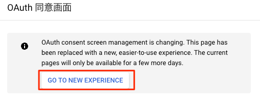 クライアント ID の作成を行います。クライアント ID の作成画面からはじめに同意画面を設定します。下記のように表示される場合は GO TO NEW EXPERIENCE をクリックしてください。