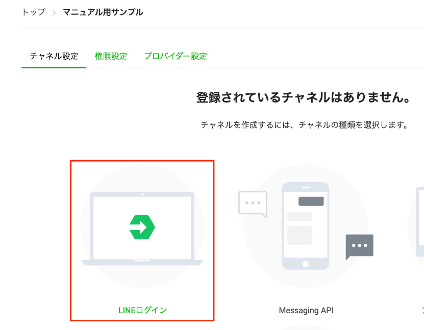次にLINEログインチャネルを作成します。チャネル設定画面で「LINEログイン」をクリックしてください。