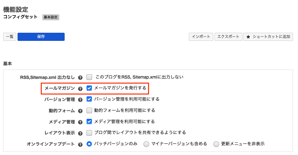 初期値はチェックがされている状態ですが、機能設定のメールマガジン機能にチェックがされていなければ動作しません。