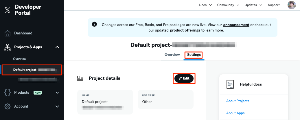 フリーアカウントではプロジェクトを1件のみ登録可能なので、Default project をそのまま使います。左メニューからプロジェクト名(Default project-xxxxx)をクリックし、Settings タブをクリックし、Project Details の Edit ボタンをクリックします。
