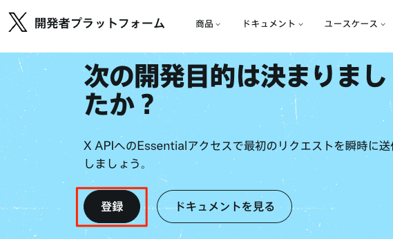 ブラウザでXにログインした状態で、 https://developer.x.com/ja にアクセスして画面下の方の「登録」ボタンをクリックします。