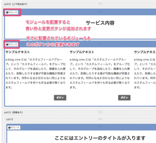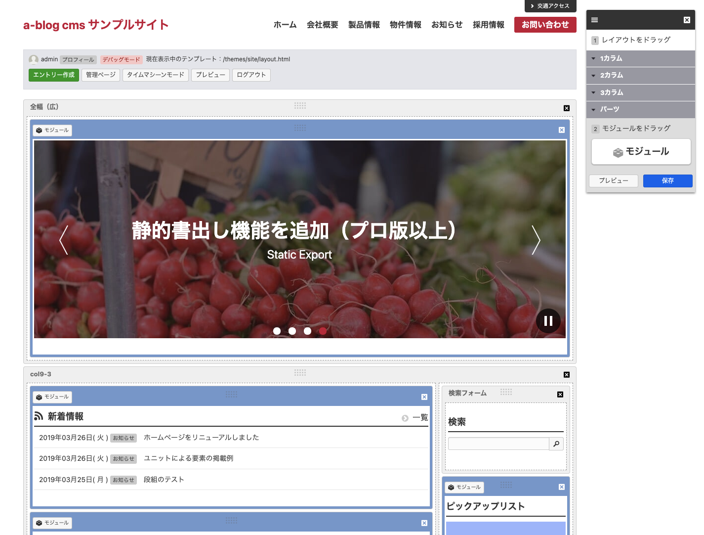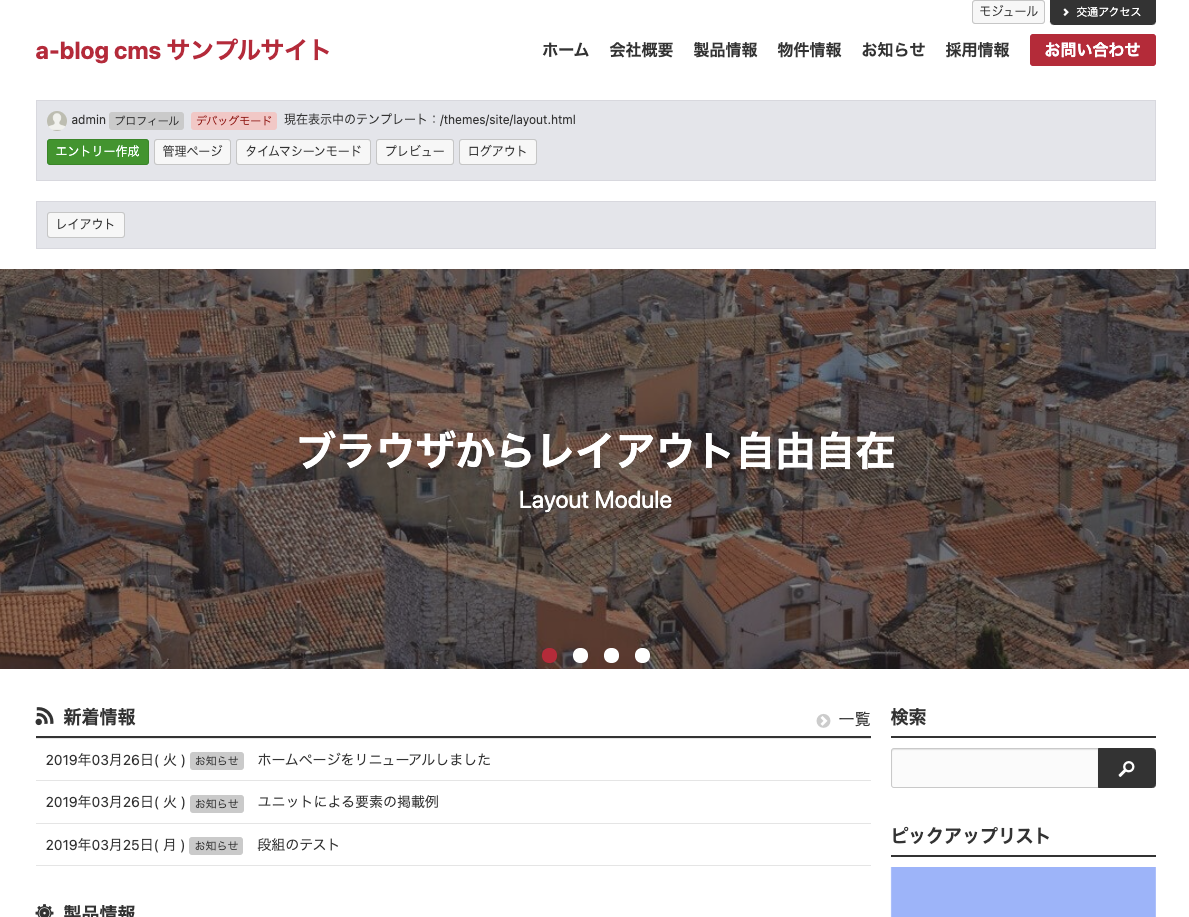a-blog cms では、表示されているページのコンテンツやレイアウトをブラウザ上から追加・変更できるレイアウト機能があります。