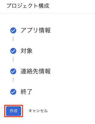 次の画面では「開始」をクリックしてください。その次の画面では、アプリ情報を登録します。指示に従って入力し、「次へ」「続行」をクリックして進み、最後に「作成」をクリックしてください。