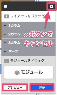 誤ってレイアウトやモジュールを削除してしまった、最初からやり直したい、という場合にはレイアウト機能の操作パネルの右上「X」ボタンでこれまでの変更内容を破棄できます。