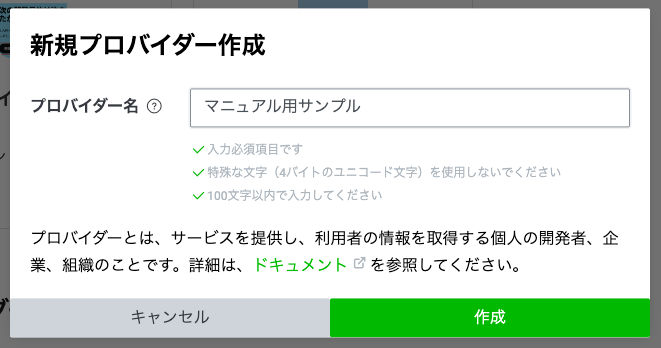 | チャネル名 | チャネルの名前(「LINE」は予約語なので含まないようにしてください。) |