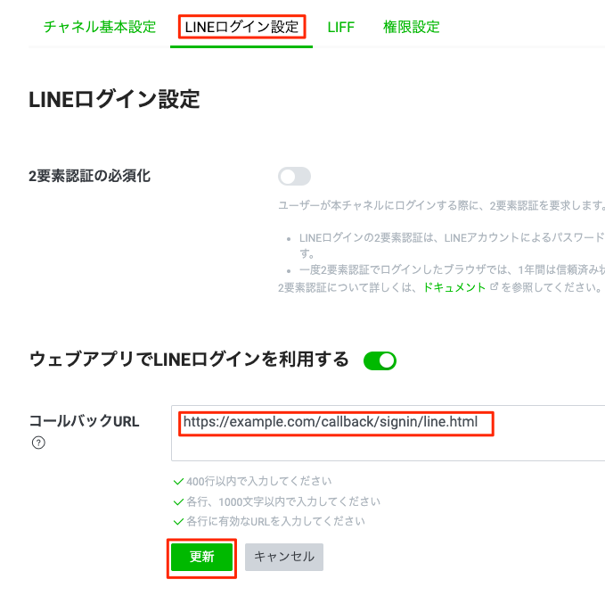 チャネルが作成できたら、LINEログイン設定タブに移動し、コールバックURLに 対象となるa-blog cmsのブログURL/callback/signin/line.html を入力して更新します。