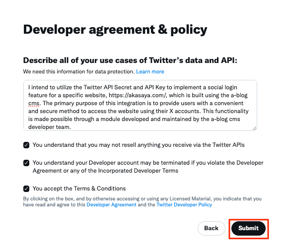 I intend to utilize the Twitter API Secret and API Key to implement a social login feature for a specific website, which is built using the a-blog cms. The primary purpose of this integration is to provide users with a convenient and secure method to access the website using their X accounts. This functionality is made possible through a module developed and maintained by the a-blog cms developer team.