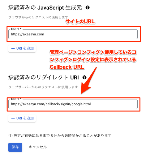 準備ができたので、OAuth クライアントを作成します。左メニューから「クライアント」を選択、アプリケーションの種類は「ウェブ アプリケーション」を選択して、分かりやすい名前を入力し、承認済みの JavaScript 生成元にはサイトのURLを、と承認済みのリダイレクト URI にはa-blog cms側の管理ページ>コンフィグ>使用しているコンフィグ>ログイン設定に表示されているCallback URL を入力して「保存」をクリックしてください。