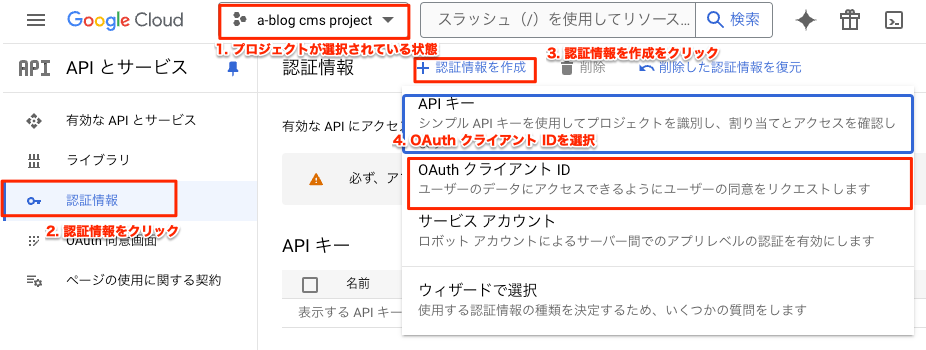 作成したプロジェクトが選択されている状態で、認証情報の作成を行います。左メニューあるいはクイックアクセスから「API APIとサービス」をクリックし、「認証情報」を選択します。「認証情報を作成」から「OAuth クライアント ID」を選択します。