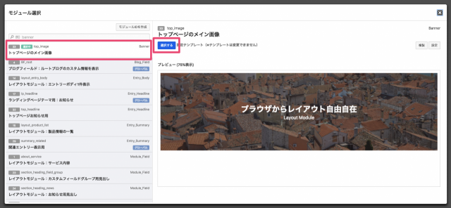 このモジュール一覧で選択したモジュールIDが、先ほどのレイアウト枠内にに表示されます。これらのモジュールIDについては、レイアウト機能とは別に管理画面からも設定・編集もできます。