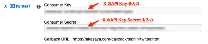 Xアカウントを使ったSNSログインのための準備として、a-blog cms の管理ページ>コンフィグ>使用しているコンフィグ>プロパティ設定 にあるX(SNSログイン用)欄に「API Key」と「API Secret」の2つの情報を入力する必要があります。
