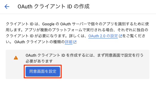 OAuthクライアント ID の作成画面で「同意画面を設定」ボタンをクリックしてください。