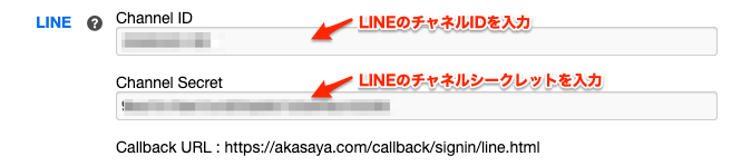 ここまでできたら、チャネル基本設定の「チャネルID」と「チャネルシークレット」をa-blog cms のSNSログインのLINEの欄にコピー&ペーストして保存します。