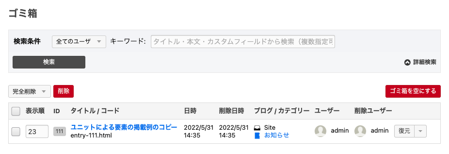 ゴミ箱内のエントリーは、公開サイト上では存在しないものとなり、ログイン状態でも非公開として表示されません。管理ページ>ゴミ箱の画面でのみ確認・操作できます。