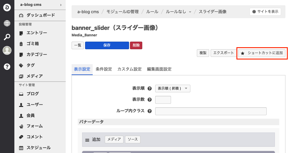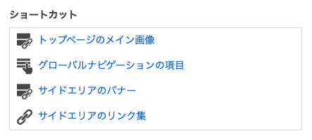 a-blog cms管理ページでは、コンフィグの各種設定ページについて、トップページにショートカット(リンク)を設定できます。よく使う機能は、わかりやすい説明をつけてショートカット化しておくと使いやすくなります。