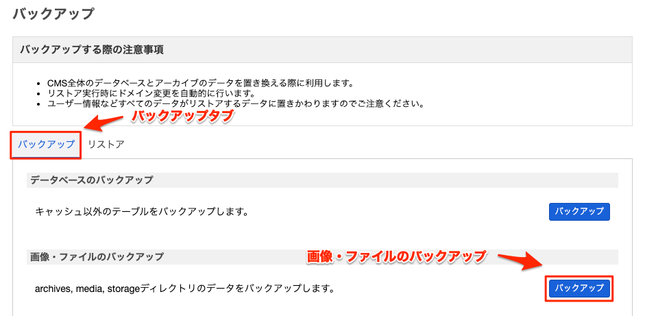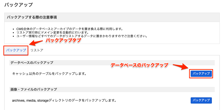 - 「バックアップ」タブのデータベースのバックアップにある「バックアップ」ボタンをクリックします。