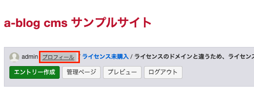 読者を含むa-blog cmsのユーザーは、自分自身でログインパスワードを変更できます。ログイン後、ユーザー管理ページから自身のアカウント右端の「変更」ボタンか、ログイン時のサイト上に表示されている管理ボックス(管理用ボタン等が表示されているスペース)内の「プロフィール」リンクから変更できます。