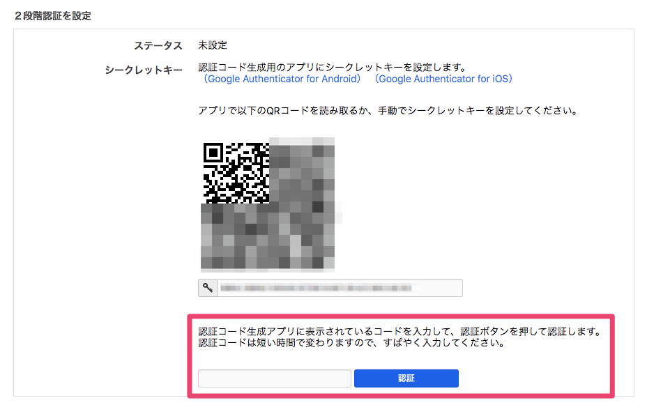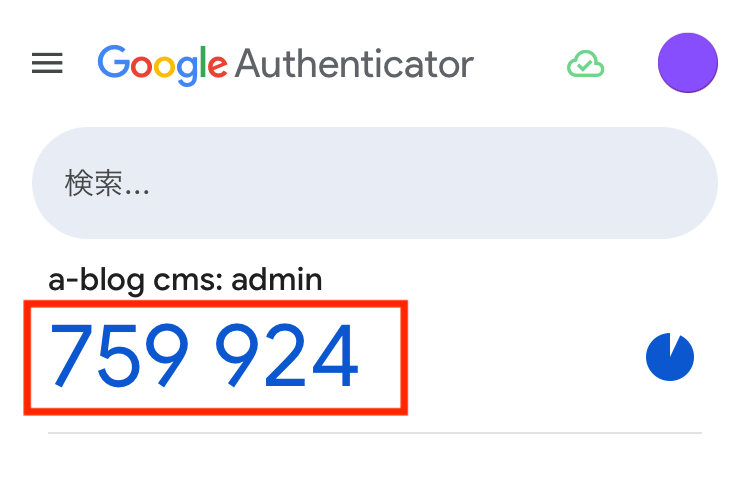 次に、Google Authenticator に表示された認証コードをCMSの2段階認証設定画面に入力し、「認証」ボタンをクリックして認証します。