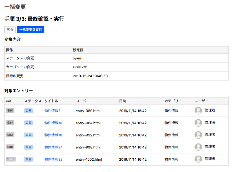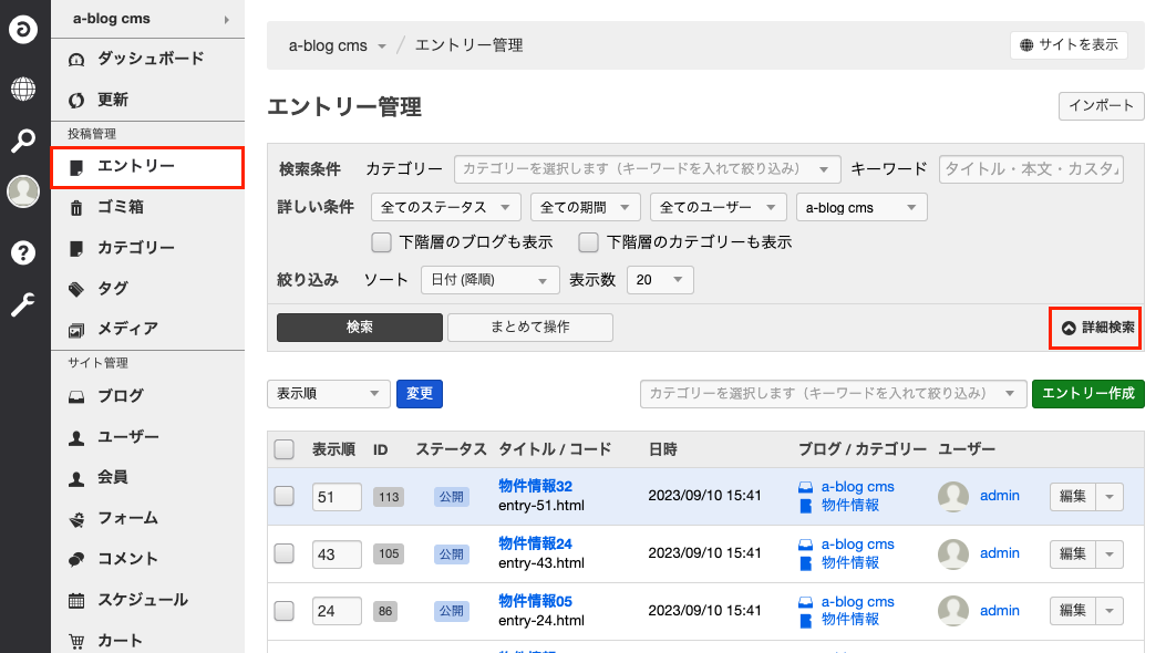 管理者としてのエントリー管理は、エントリーの詳細ページでは出来ない、複数エントリーに対する一括処理やエントリーが所属するブログ、エントリーのオーナーとなるユーザーの変更などが主な役割となります。