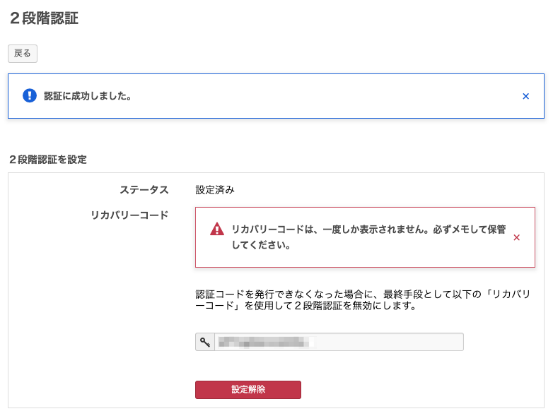 2段階認証の設定に成功すると、リカバリーコードが表示されます。このリカバリーコードは一度しか表示されないため、必ずどこかにメモをしてください。リカバリーコードはログアウトした状態から2段階認証を解除したい場合に役立ちます。
