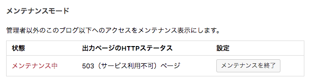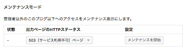 メンテナンスモードに切り替えるためには「メンテナンス開始」ボタンをクリックし、終了時には「メンテナンス終了」ボタンをクリックします。