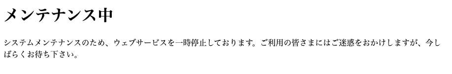 メンテナンスモードとは、ダッシュボードの画面からウェブサイトの表示をメンテナンス用テンプレートに切り替える仕組みです。デフォルトではメンテナンス画面は次のようになります。