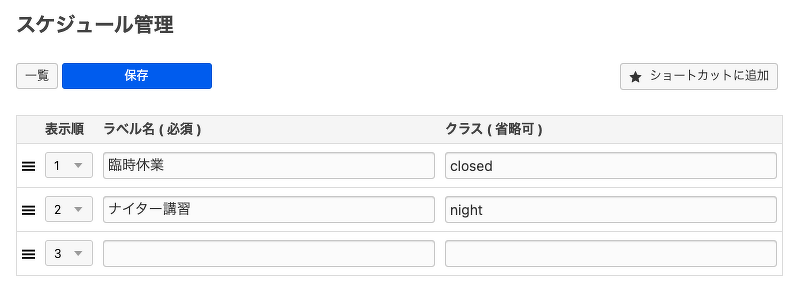 スケジュールセット一覧画面の、ラベルの「設定」ボタンで、そのスケジュールセットに登録されているラベル情報が表示されます。ラベルと、必要に応じてクラスを設定し、「保存」ボタンで変更内容を保存します。ラベルの表示箇所やクラスの装飾はテンプレートに依存していますので、テンプレートの変更が必要な場合にはサイト制作者、カスタマイズ担当者にご相談ください。