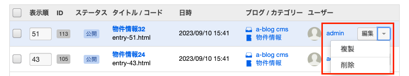 エントリー個別に対しての編集や複製、削除は、各エントリーの右端にあるプルダウンからできます。