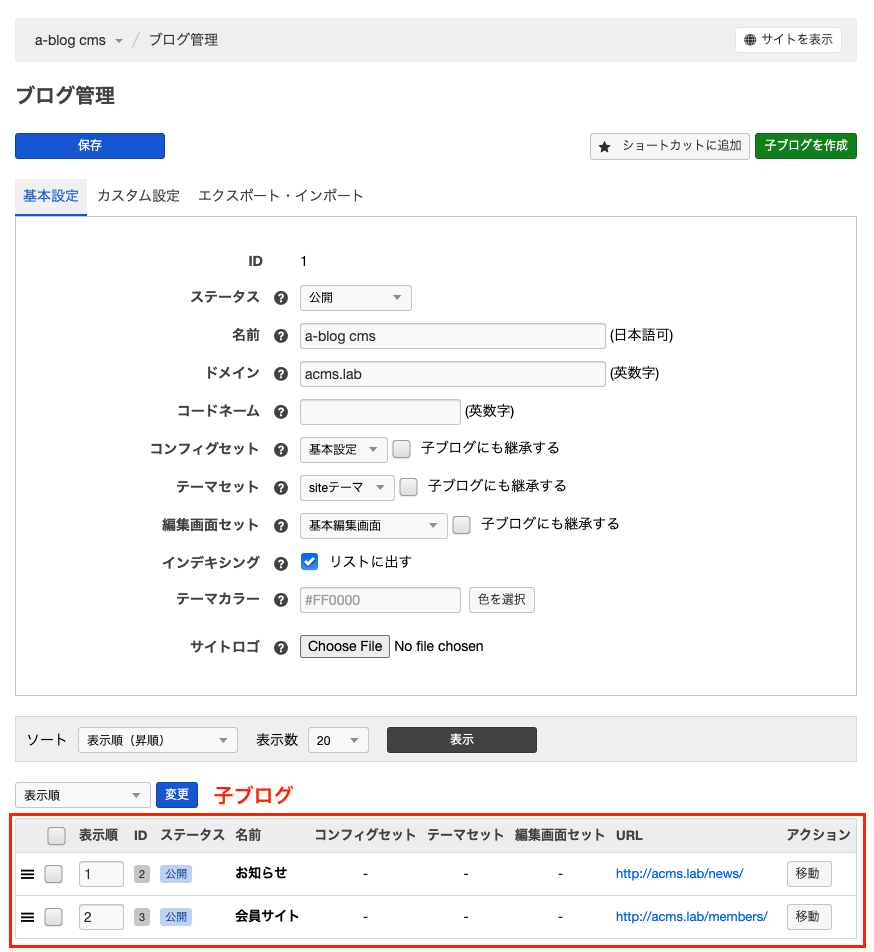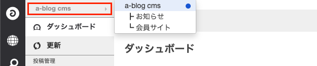 a-blog cmsでは、ブログという単位でコンテンツを管理しています。 ユーザーを含む様々な設定は基本的にはブログ単位で行われます。管理ページはブログごとに存在しますので、管理したいブログから管理ページに移動するか、管理ページ内左上のブログナビゲーションからルートブログ名をクリックして管理するブログを選択してください。