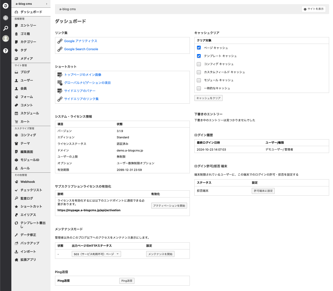 a-blog cms の管理ページに移動すると、最初にダッシュボードと呼ばれるページが表示されます。このページにはライセンスやバージョンの情報、ユーザーのログイン履歴や下書きとなっているエントリーなど、サイトの基本情報が掲載されています。