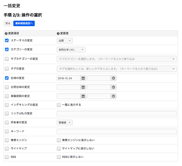 手順 2/3:操作の選択の画面まで進んだら、変更したい変更項目にチェックをつけ、変更値を入力します。(カスタマイズされている場合は、カスタムフィールド の内容も変更可能です)