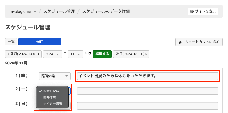 最初に当月の情報が表示されます。日付ごとにラベルを選択したり内容を入力、編集したりして、月ごとに「保存」をクリックしてください。必要に応じて次月や前月に移動して入力、編集、保存してください。