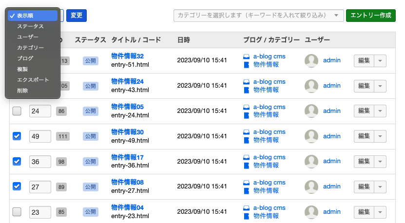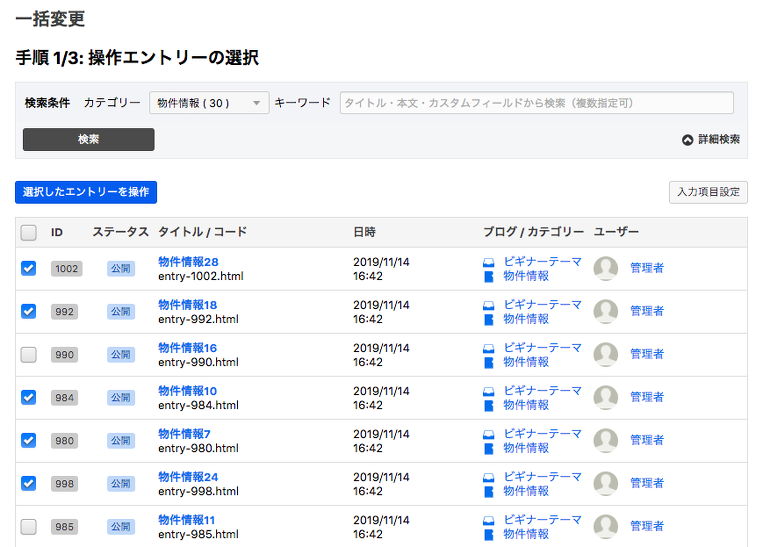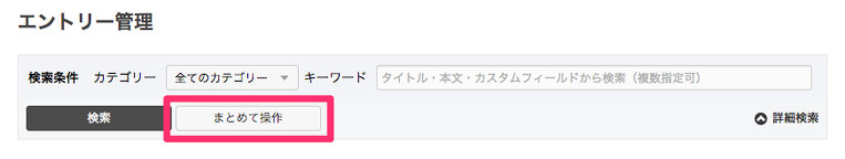 セレクトメニューからの複数エントリーの一括処理より細かい情報を一括で操作する方法として、エントリーのまとめて操作も用意されています。