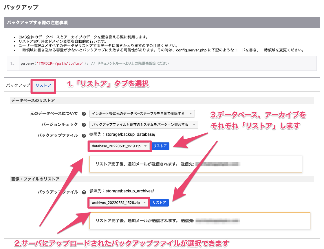 - リストアするデータとなるバックアップファイルを選択します。ここで選択できるファイルは手順1. でbackup_databaseディレクトリ、backup_archivesディレクトリにアップロードしたファイルです。