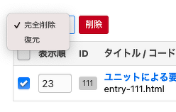 削除=ゴミ箱に入ったエントリーのデータを完全に削除してしまう場合には、リストから削除したいエントリーを選択して、画面左上のメニューから完全削除を選択して削除します。