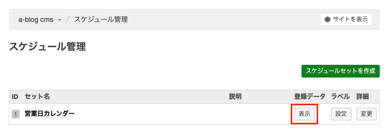 管理ページ>スケジュール管理内の登録データの「表示」ボタンで、そのスケジュールセットに登録されている情報が表示されます。