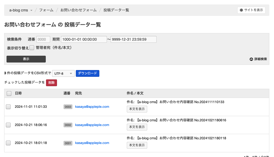 フォームIDのリスト右側の「投稿データ」ボタンから投稿データ一覧に移動します。この画面ではこのフォームIDに送られたメールの内容がリストとして表示されています。