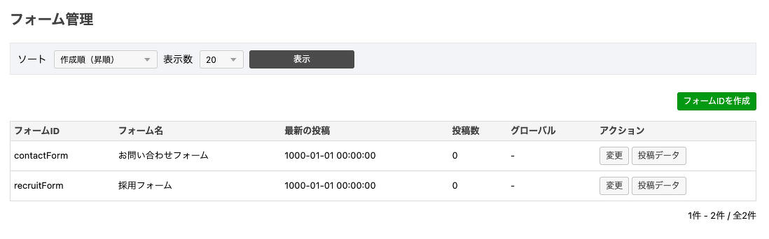 管理画面左側のメニュー[フォーム]から、フォームIDの一覧画面へ移動します。管理ページ>フォーム管理画面には各フォームIDについて、情報を確認・編集できる「変更」と、そのフォームIDヘ投稿されたデータの確認ができる「投稿データ」の2つのボタンがあります。