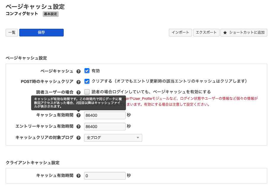 また、管理ページ>コンフィグ>使用しているコンフィグ>キャッシュ設定 より、有効時間や対象ブログを細かく設定できます。この画面に限らず、管理画面の設定項目のほとんどにはツールチップが用意されています。設定時にはツールチップを参考にしてください。
