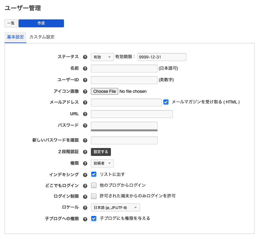 | 投稿者 | 新規エントリー作成・自分が作成したエントリーの編集/投稿管理(エントリー)/サイト管理(ユーザーのプロフィールのみ)/Ping送信ができます |
