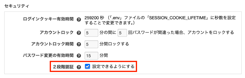 2段階認証を設定するには、管理ページ>コンフィグ>使用しているコンフィグ>ログイン設定のページに移動し、「2段階認証」の項目を有効にします。