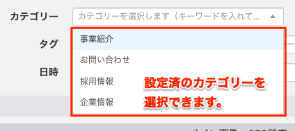 カテゴリーの設定自体が既にされている場合は、エントリーの登録または変更画面でプルダウンメニューから選択できます。