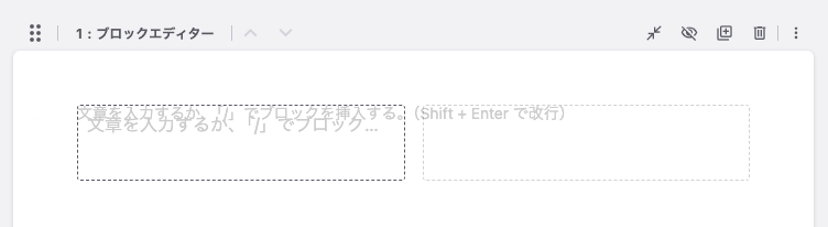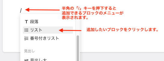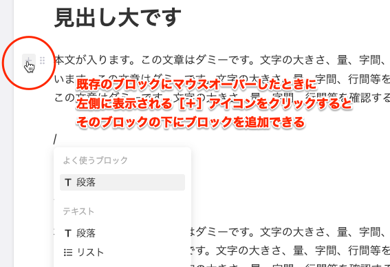 ブロックエディターユニット内にブロックを追加するには、半角の「/」キーを押下します。また、既存のブロックにマウスオーバーすると左側に現れる[+]アイコンをクリックすると、そのブロックの下にブロックを追加することができます。通常の段落などテキスト入力の場合にはそのままテキストを入力することも可能です。
