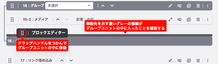 ドラッグハンドルをつかんでグループ・ユニットの中に移動します。