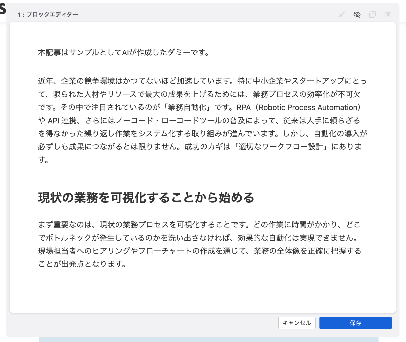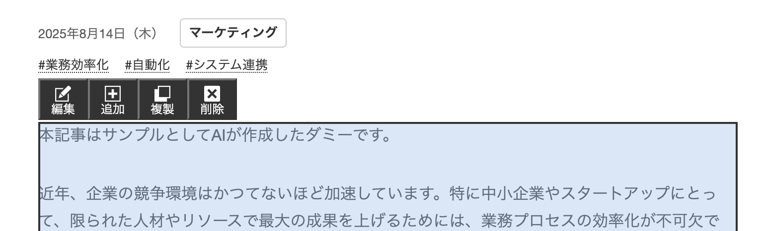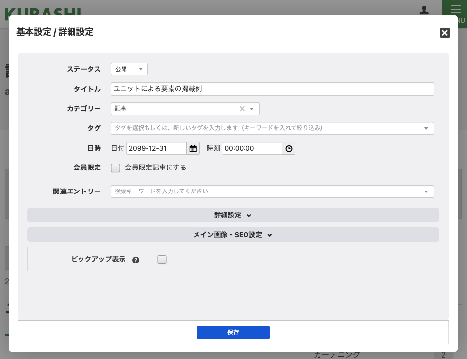 ダイレクト編集がONの場合にタイトルをクリックすると、通常は編集画面で変更する項目について画面遷移をせずにポップアップで呼び出しができます。このポップアップ画面で変更した内容は、ポップアップ画面内の保存ボタンを押した時点で反映されます。