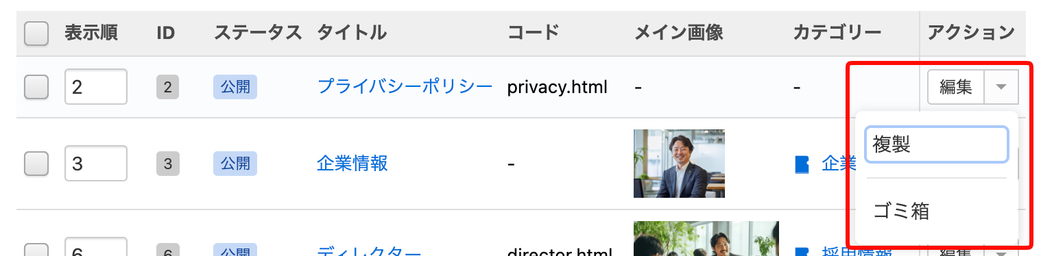 各エントリーの右端にある「アクション」カラムの[編集]ボタンではエントリーの編集画面に移行することができます。また、編集ボタンの右側にある▼をクリックすると、エントリーを複製したり、ゴミ箱に移動したりすることができます。