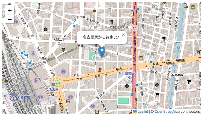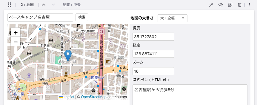 スポット名で検索して地図を表示することができます。地図の大きさ、ズーム、アイコンをクリックしたときの吹き出しの内容も設定可能です。(OpenStreetMap ではなく、Googleマップで表示されるカスタマイズがされている場合もあります。)