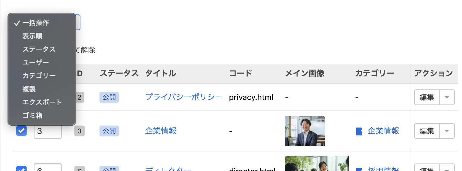 また、エントリー左側のチェックボックスでエントリーを選択した状態では、一括操作が可能です。一括操作によって表示順、ステータス、ユーザー、カテゴリーを変更したり、複製、エクスポート、ゴミ箱への移動を実行したりできます。